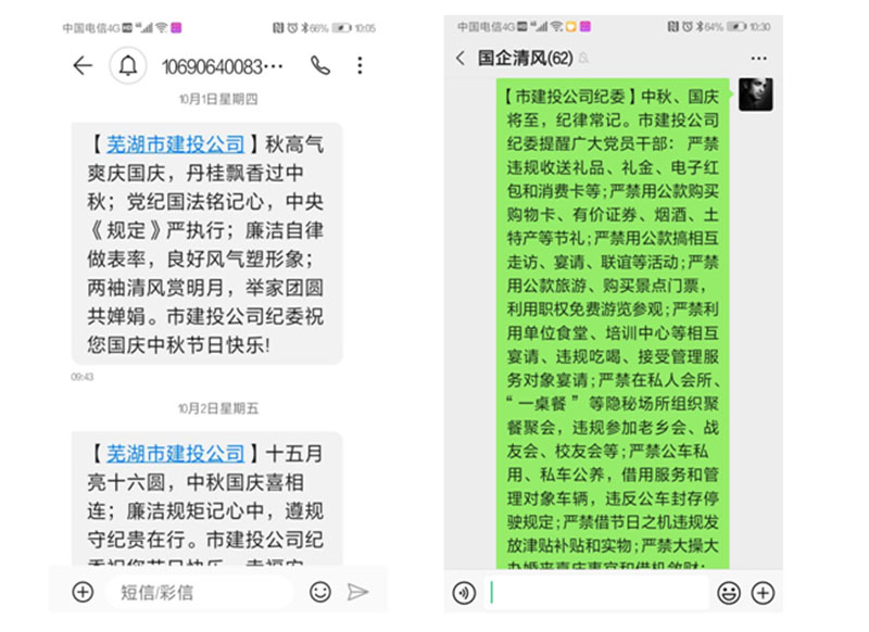 發(fā)送廉政短信。中秋國(guó)慶前期和期間,公司紀(jì)委向全體干部員工及控股企業(yè)領(lǐng)導(dǎo)班子成員累計(jì)發(fā)送廉政短信348條次,通過企業(yè)微信群累計(jì)發(fā)送廉政提醒14次,在表達(dá)節(jié)日祝福的同時(shí),提醒廣大領(lǐng)導(dǎo)干部嚴(yán)格遵守廉潔自律各項(xiàng)規(guī)定,繃緊廉潔自律這根弦,筑牢拒腐防變這道防線。