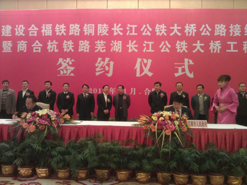 在簽約儀式上,省投資集團公司分別與蕪湖市政府、銅陵市政府簽訂了“合作建設(shè)合福鐵路銅陵長江公鐵大橋公路接線工程和商合杭鐵路蕪湖長江公鐵大橋工程”框架協(xié)議;省投資集團公司分別與蕪湖市交投公司和銅陵市交投公司簽署“合作建設(shè)合福鐵路銅陵長江公鐵大橋公路接線工程合同書”。兩項投資協(xié)議的簽署標(biāo)志著商合杭鐵路蕪湖長江公鐵大橋、合福鐵路銅陵長江公鐵大橋公路接線工程兩個項目公司正式成立運作,對我市實施擁江發(fā)展具有重大的戰(zhàn)略意義。